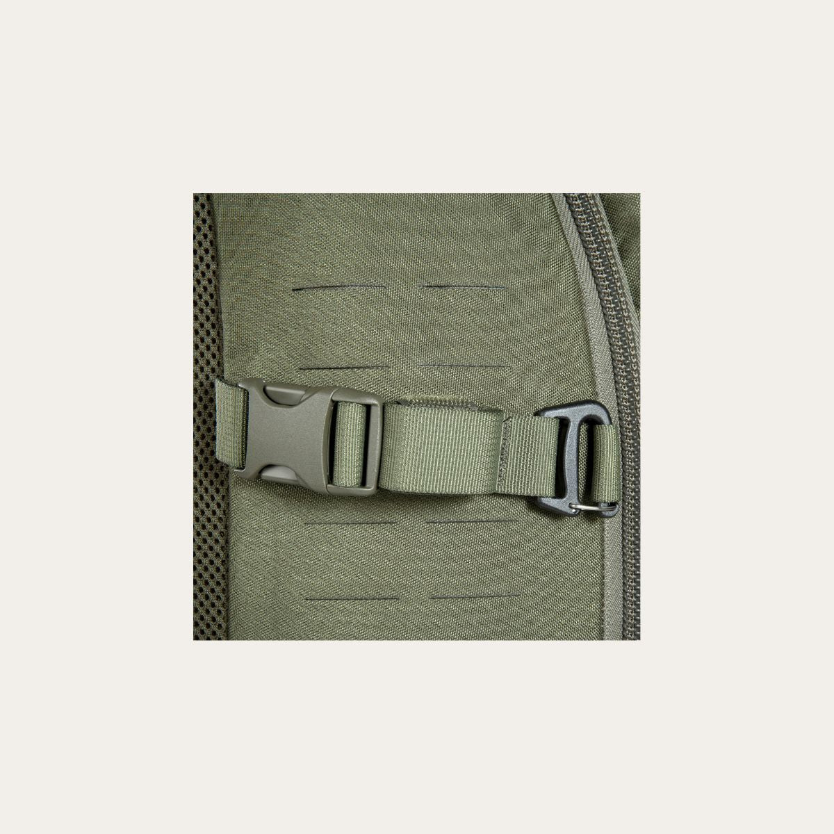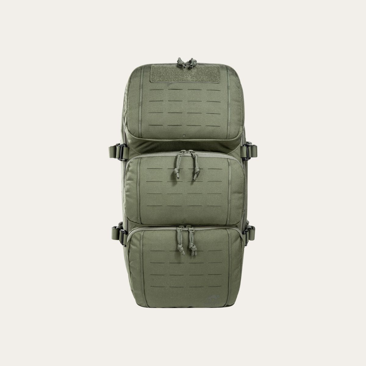 Front und Seiten sind mit einem M.O.L.L.E-System in Laser Cut Ausführung versehen. An den Seiten stehen jeweils zwei M.O.L.L.E-Schlaufen in der Breite und drei Schlaufen in der Höhe zur Verfügung. Ein Gurtbandsystem ermöglicht die Aufnahme zusätzlicher Ausrüstung. Die Seitenkompression mit Steckschliessen hält das Packmass auch bei Teilbeladung kompakt.