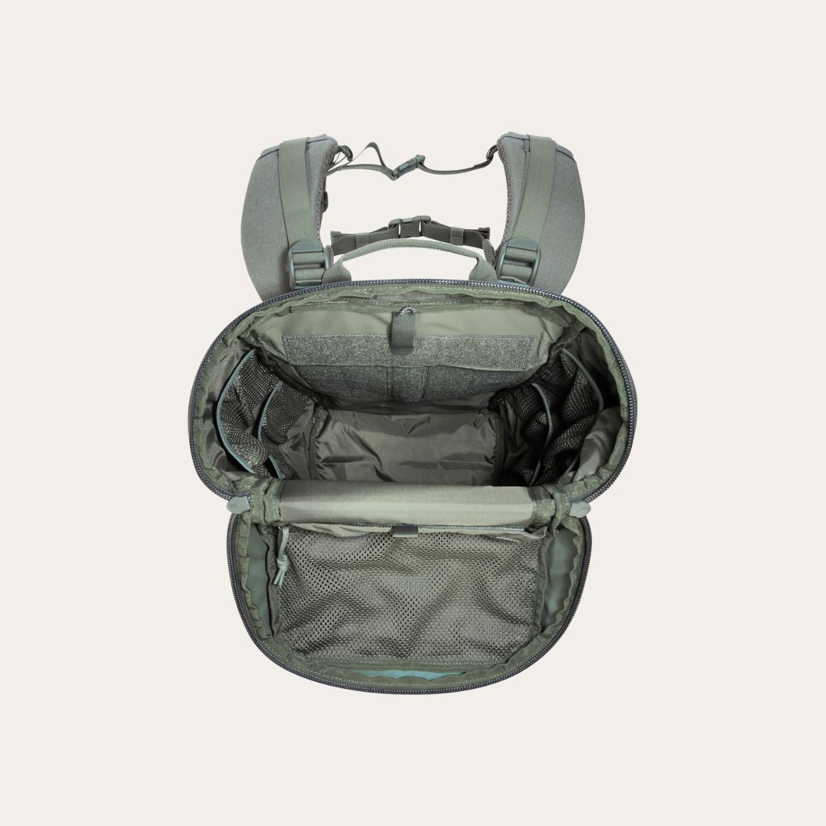 Das Hauptfach ist von oben zugänglich und bietet eine grossflächige MOLLE-Klettfläche zur individuellen Erweiterung. Mehrere Netztaschen im Inneren sorgen für Übersicht. Im Deckel befindet sich ein separates Fach mit Reissverschluss und Netzabdeckung. Darin lassen sich kleinere Ausrüstung wie ein persönliches Erste-Hilfe-Set oder ein Multitool unterbringen. Eine Trinksystemvorbereitung ist ebenfalls vorhanden.